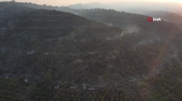 Bursa'nın Büyükorhan ilçesinde ormanlık alanda çıkan yangın günün ilk ışıklarında havadan görüntülendi. Bin personelin havadan ve karadan müdahalesi sürerken, yangın kısmen kontrol altına alındı.