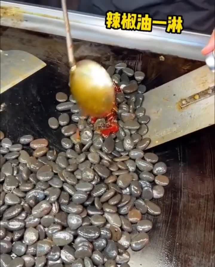 Çin'de sokak lezzetleri arasına yeni bir yemek eklendi. Taş kızartması diyebileceğimiz bu yemek, taşların tavada kırmızı biber ve sarımsak gibi karışımlarla pişirilip servis ediliyor.