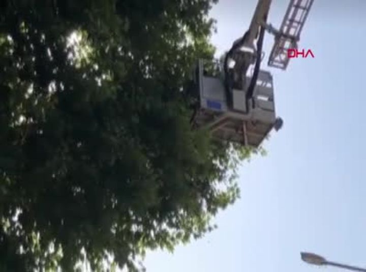 Bursa'nın İnegöl ilçesinde ağaca çıkan kedi, itfaiye ekipleri ile esnaflar tarafından kurtarıldı. O anlar amatör kameraya yansıdı.
