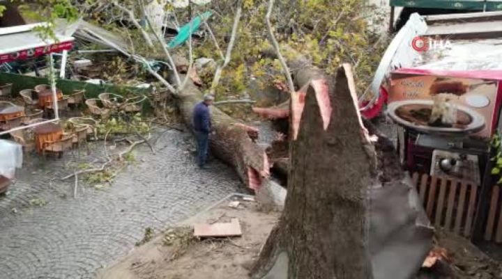 Bursa'da saatteki hızı 100 kilometreye ulaşan şiddetli lodos tarihi Kozahan'daki 250 yıllık çınar ağacını kökünden söktü. Olayın gece yaşanması muhtemel faciayı önlerken, kafeteryalar da çınarın kırılan devasa dallarıyla zarar gördü. Devrilen çınarın görüntüsü dron ile görüntülendi.