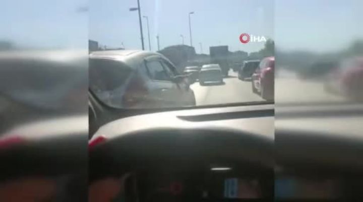 İstanbul Küçükçekmece'de E-5'te içerisinde hamile kadının olduğu aracın önünü keserek yumruklayan sürücü şoke etti. Yaşanan korku dolu anlar ise cep telefonu kamerasınca kaydedildi.