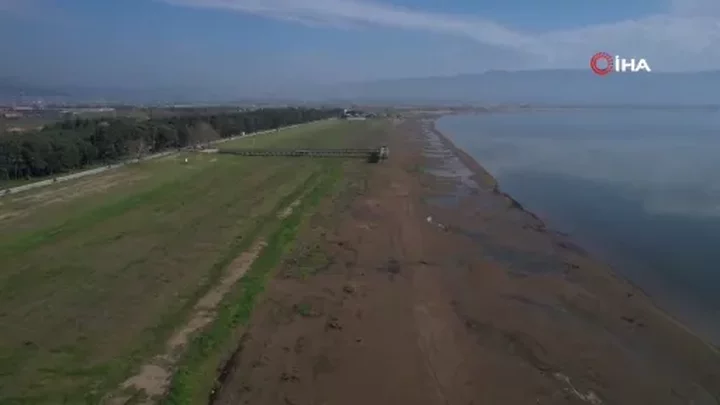Bursa'nın Orhangazi ilçesi sahilinde bulunan İznik Gölü'nde su yaklaşık 300 metre çekildi. Daha önce teknelerin yanaştığı iskele bölgesinde artık yürünebildiği görülürken, göldeki ciddi su kaybı dron ile havadan görüntülendi. Geçen yıl su kesintilerinin yaşandığı Bursa'da üç barajda dolup taşarken, İznik Gölü'nde yoğun yağışlara rağmen su çekilmesi üreticileri ve bölge halkını kara kara düşündürüyor.