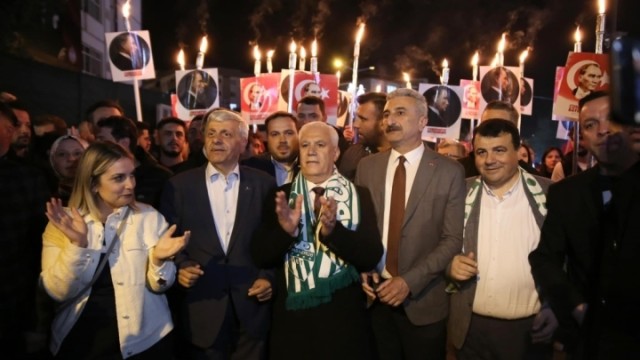 Bursa Büyükşehir Belediye Başkan Adayı Mustafa Bozbey için Orhangazi'de toplanan binlerce vatandaş fener alayı oluşturarak meşaleler ve bayraklarla yürüdü.
