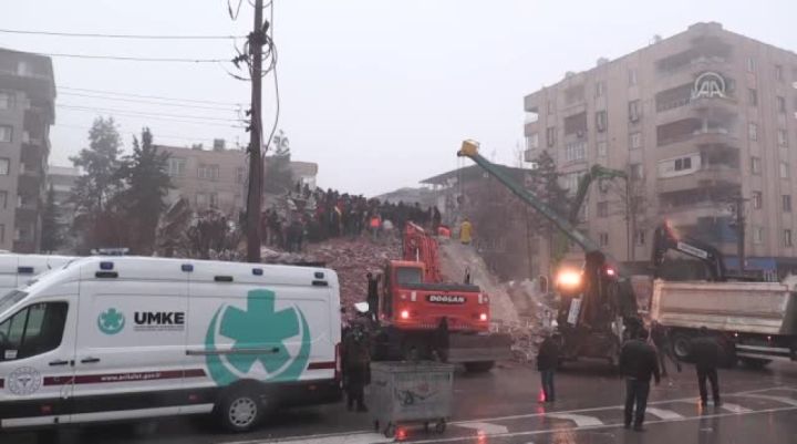 Kahramanmaraş'ın Pazarcık ilçesinde 7,4 büyüklüğündeki deprem nedeniyle Şanlıurfa'nın Haliliye ilçesi İpekyolu caddesindeki yıkılan binadan yaralı vatandaş enkazdan böyle çıkarıldı.