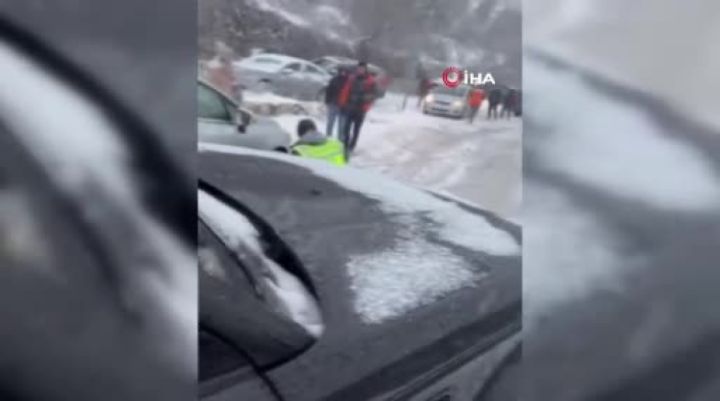 Bursa'da Uludağ'dan cipiyle inmek isteyen sürücü, kar ve buzda zor anlar yaşadı. Mahsur kalan aracı onlarca kişi iterek kurtarırken, araç bu kez de buzlu yolda kaymaya başladı. Vatandaşların durdurmak için uğraştığı cip metrelerce ilerledikten sonra dururken, panik dolu anlar kameraya yansıdı.