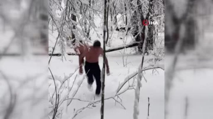 Bursa'da iki arkadaş, dondurucu soğuğa aldırış etmeden Uludağ'ın eteklerinde yarı çıplak bir şekilde karın tadını çıkardı.