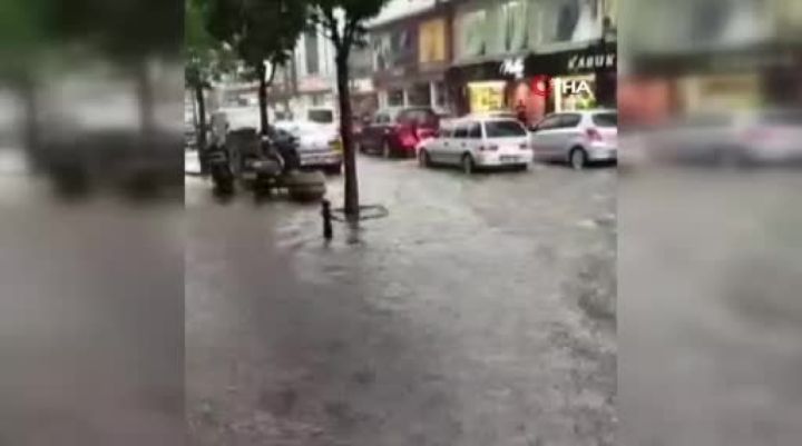 Bursa'nın İnegöl ilçesinde şiddetli yağmurun etkisiyle sokak ve caddeler göle döndü. Bisikletiyle yolda ilerlemeye çalışan bir vatandaş ise derinliği kestiremeyince suya battı. O anlar, kameraya saniye saniye yansıdı.